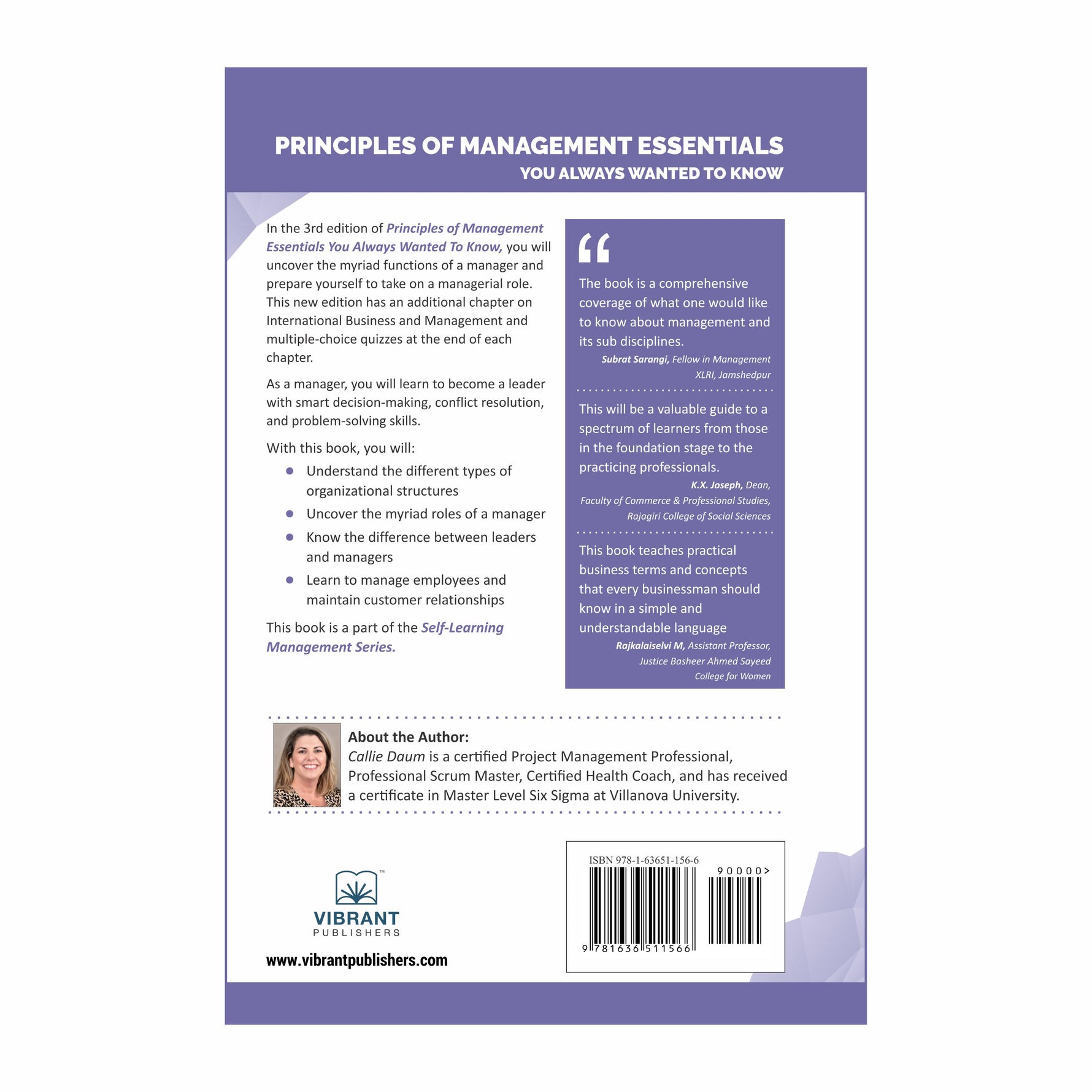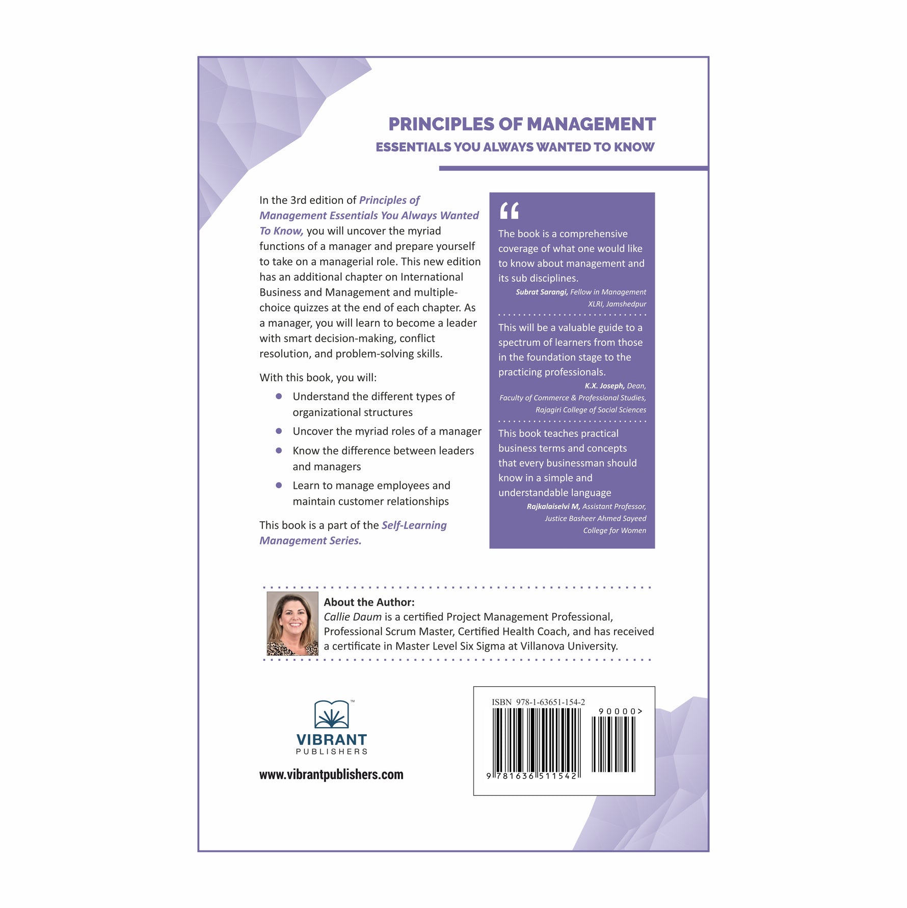 Callie Daum’s Principles of Management Essentials book provides startup founders and management students a thorough understanding of managerial concepts. It is simple to understand, well-structured with flow charts and covers a wide range of business topics such as Human Resource Management, Quality Management, Customer Relationship Management and International Business and Management. This book guides the readers through the real-world application of management skills. All the books in the Self- Learning Management series of Vibrant Publishers give clear insights on all subject areas of management and and can be used by undergraduate and postgraduate students.