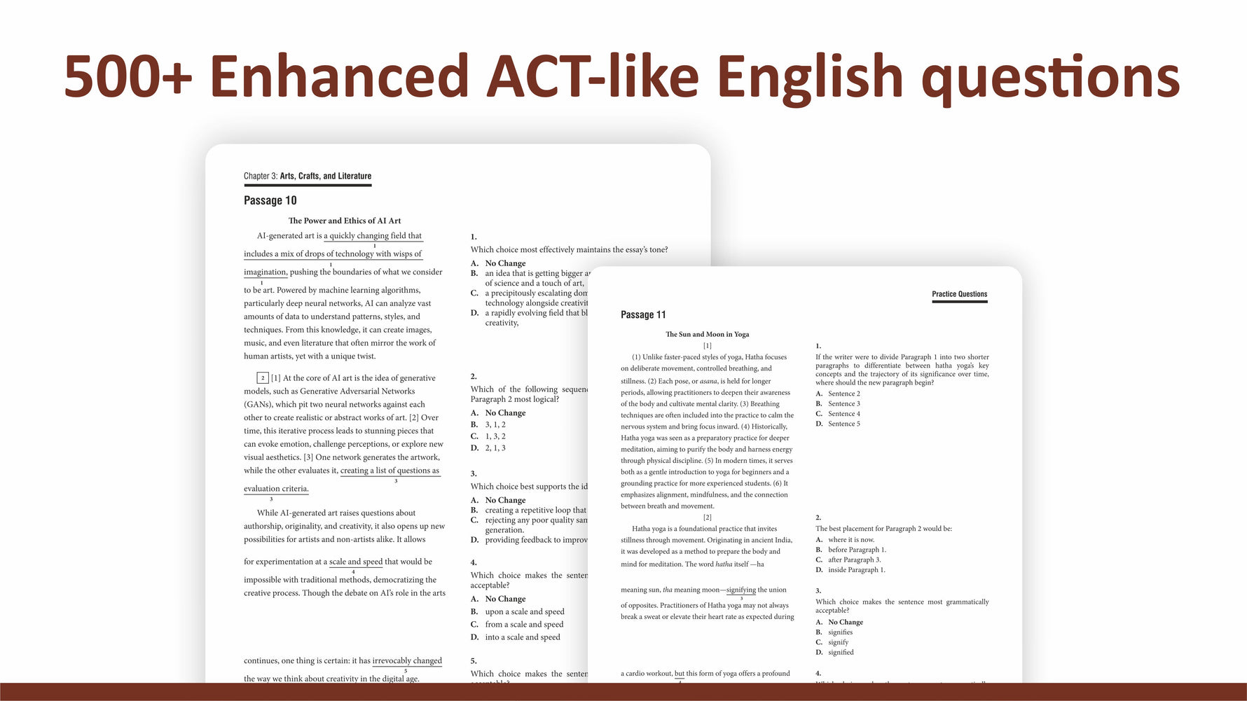 ✔️ 500+ practice questions that mirror the Enhanced ACT English format—ideal for drilling weak areas or building confidence through repetition