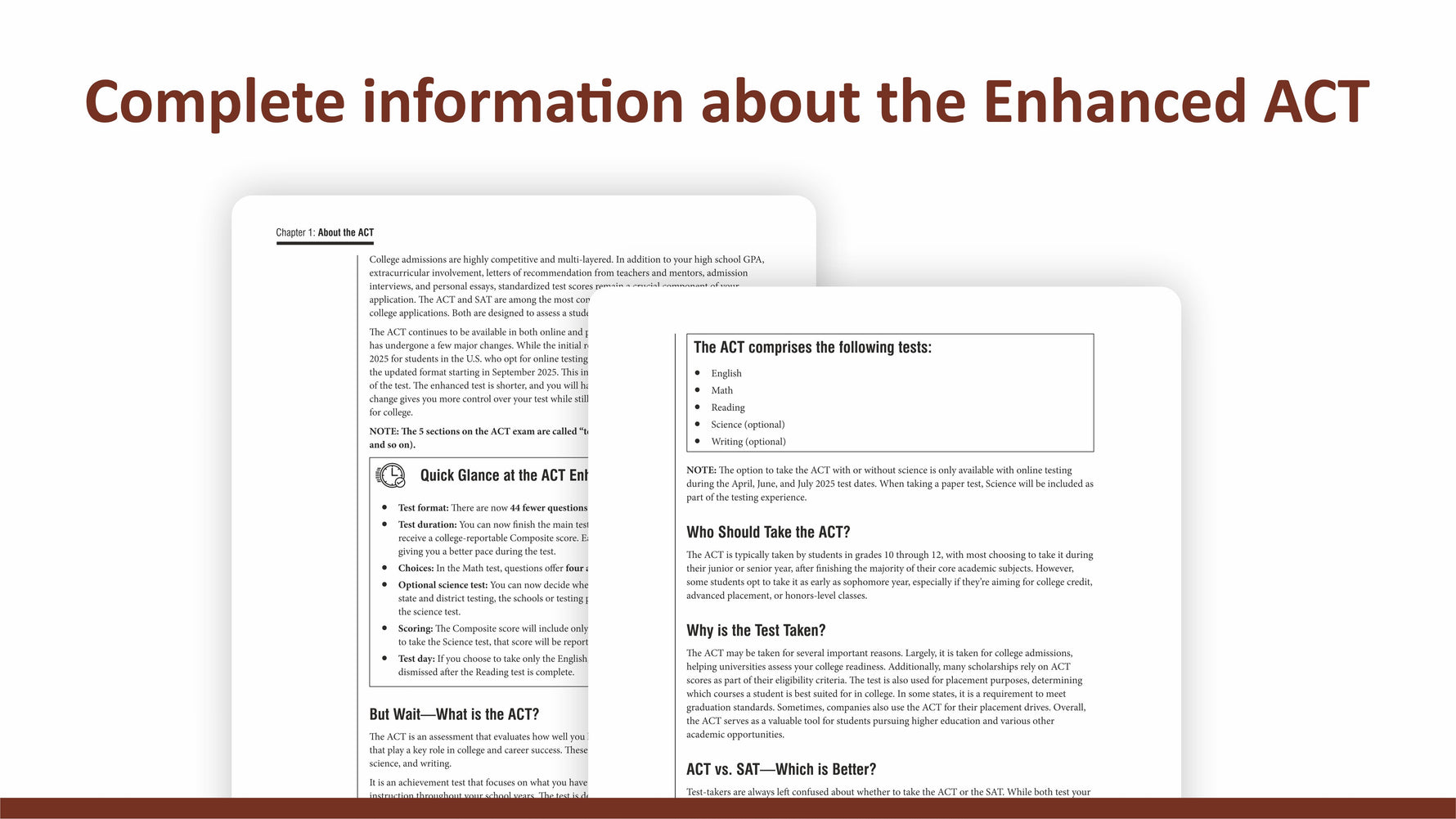 The book has a lot of practice questions in the Enhanced ACT format, something which the official guide also does not have. The answer explanations are logical and I loved that the book has explanations for distractors too. With a lot of ambiguity around the new ACT, this book gave me clarity and helped me improve. Go for it!
