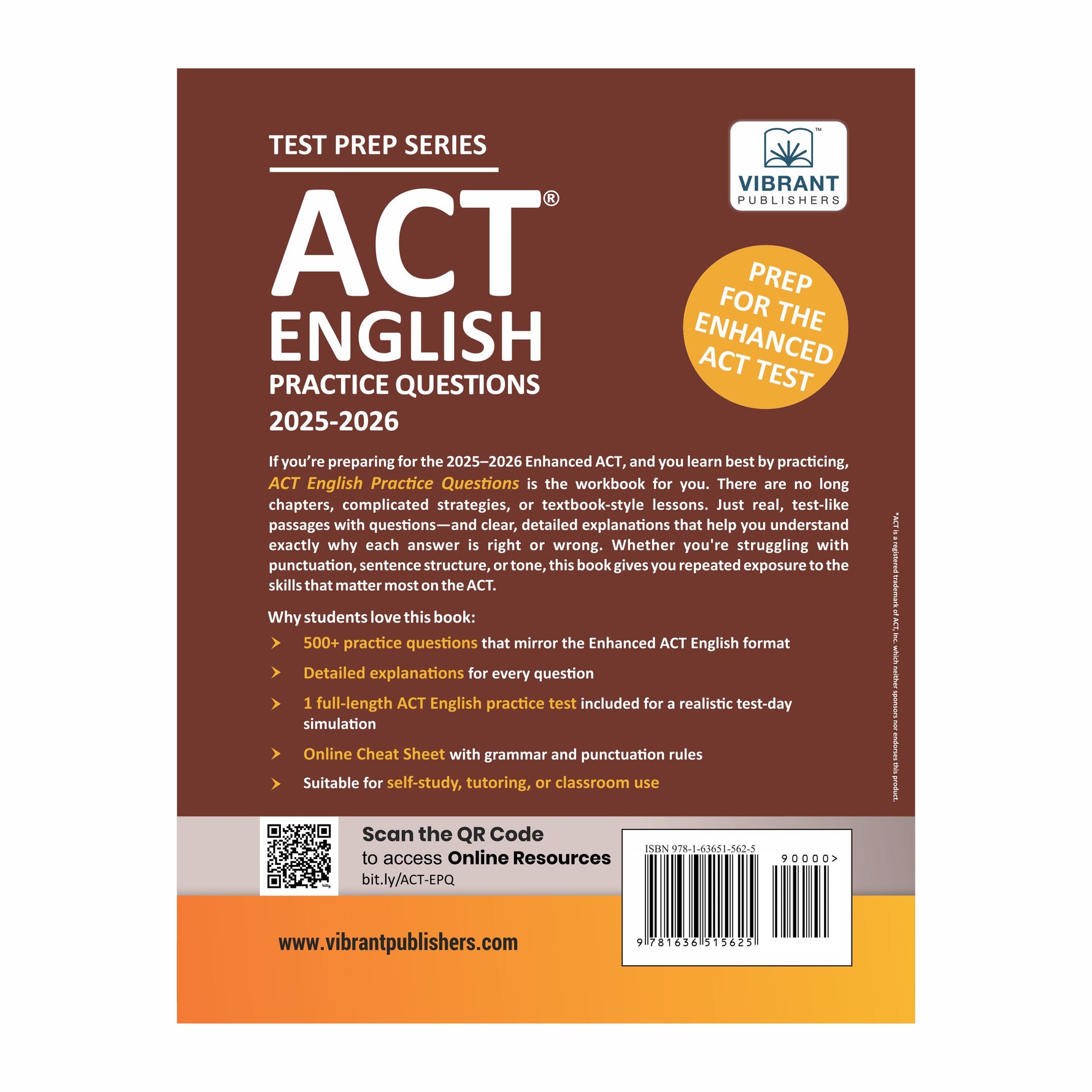 If you’re preparing for the 2025–2026 Enhanced ACT, and you learn best by practicing, ACT English Practice Questions is the workbook for you. This book is packed with 500+ high-quality, exam-style questions to help you master the English section through focused and consistent practice.