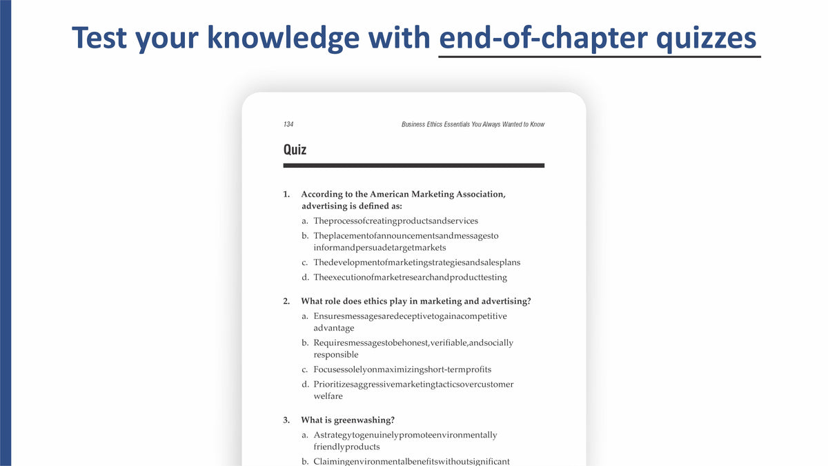 Business Ethics Essentials is your roadmap to making integrity a core business asset. It will help you succeed in today’s ever-evolving environment while staying true to your values. It equips you with global perspectives on the role of ethics in finance, marketing, and human resource management in a volatile business world.