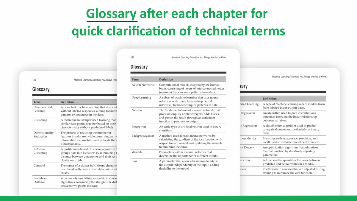 Machine Learning Essentials You Always Wanted to Know is a concise, beginner-friendly guide that demystifies machine learning for students and professionals alike. The book stands out for its clear explanations and practical approach, covering foundational algorithms and concepts without overwhelming readers with math or jargon. It introduces core topics-such as supervised and unsupervised learning, key algorithms, and evaluation metrics-using real-world examples and hands-on coding exercises in Python, making it easy for newcomers to follow along.