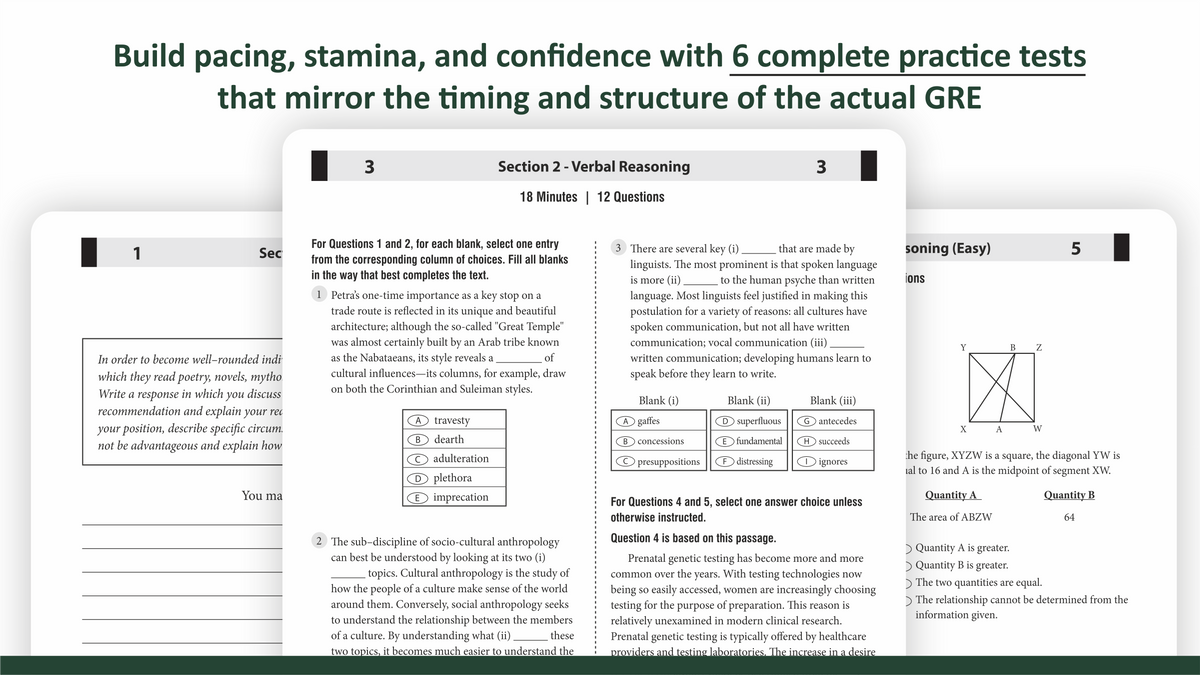 Practice Tests for the GRE is a highly effective tool for students who need rigorous, exam-like practice to build confidence and identify areas for improvement. The book includes six complete GRE-style practice tests, each meticulously designed to mirror the structure and timing of the actual exam. This allows test-takers to build stamina, practice time management, and familiarize themselves with the GRE's adaptive format. Each test covers all GRE sections—Verbal Reasoning, Quantitative Reasoning, and Analytical Writing—providing a holistic practice experience. The questions reflect the diversity and complexity of those found on the real exam, including text completions, reading comprehension, quantitative comparisons, and problem-solving items. The answer keys include thorough explanations for each question, helping students understand not only the correct answer but also the reasoning behind it. This is particularly valuable for identifying patterns in mistakes and improving weak areas. Its strength lies in its authenticity and depth, making it a top-tier resource for serious GRE aspirants, ideal for honing test-taking endurance and accuracy.