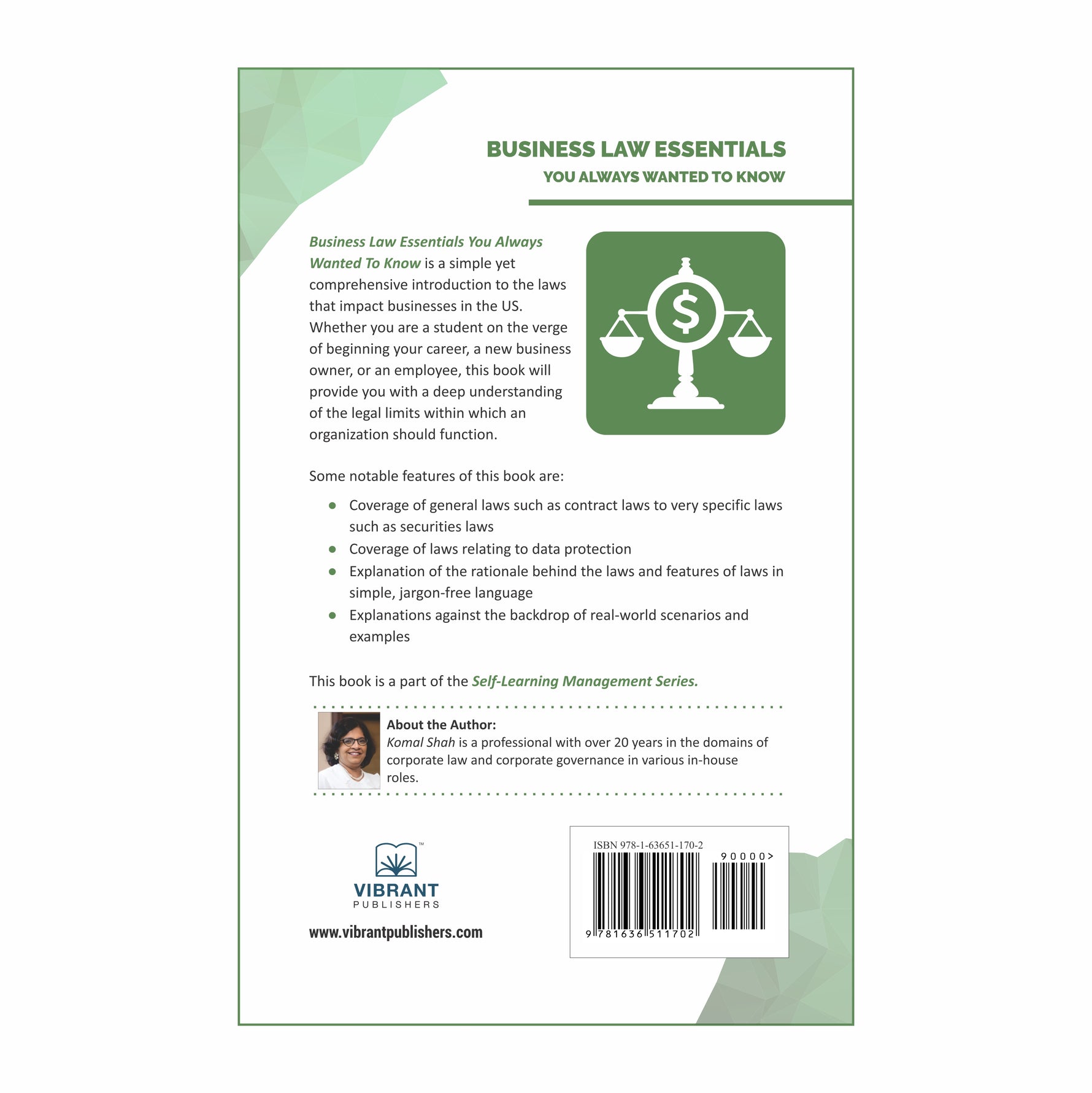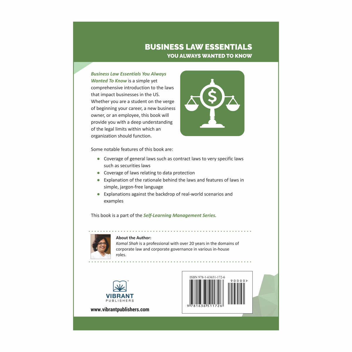 Business Law Essentials is a compact but handy guide for learning about business laws in the US. Whether you are a student on the verge of beginning your career, a new business owner, or an employee, this book will provide you with a deep understanding of the legal limits within which an organization should function and how an organization interacts with the regulators for the specific business sector.