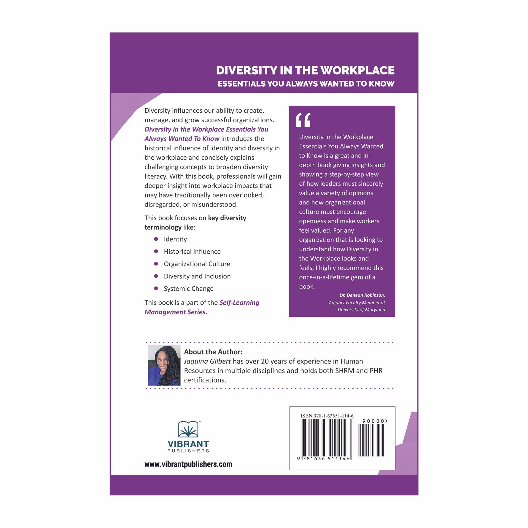 Jaquina Gilbert with her vast experience and expertise in the field of Human Resources has included in her observations the comprehensive variables of workplace diversity viz. physical, psychological, behavioural, racial, cultural, ethnical, lingual, religious, and in economic status, etc. The author courteously illustrated the impact of these variables on the development and practices of organizational culture and explained how they can be applied to improve work styles for enhanced outputs.