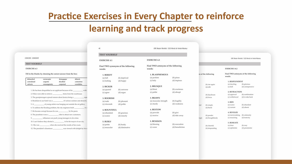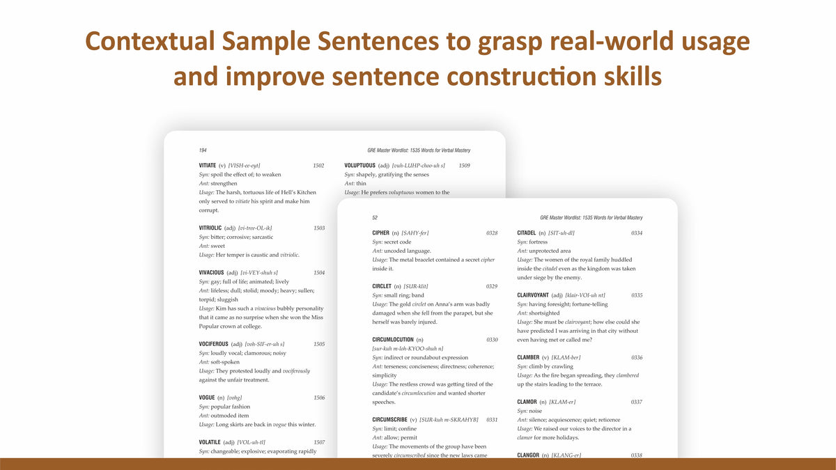 Crafted by GRE experts with years of experience, this comprehensive guide is your ticket to mastering essential GRE vocabulary efficiently and effectively. No need to sift through endless dictionaries or struggle with thesauruses – we've done the hard work for you.