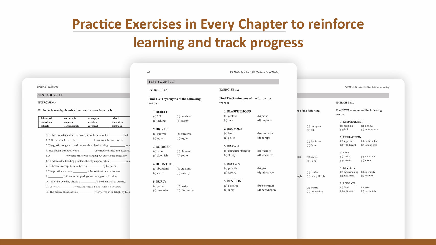 Very good book. I especially like the "How to Get the Most Out of this Book" section. It gives several good tips on how to learn these vocab words faster and explains why to even try to expand your vocabulary. The layout is extremely easy to use (even as an eBook) with clear formatting differences between entry words, synonyms & antonyms, and exercises. The checkup exercises included after each chapter are very helpful too! For those who want extra practice, even more self-test exercises are available on vibrantpublisher's website. If you're gonna read this book, be prepared to take your time and think deep because a lot of these vocabulary words may be unfamiliar. But by following their guidelines for learning them, you'll be expanding your vocabulary in no time!
