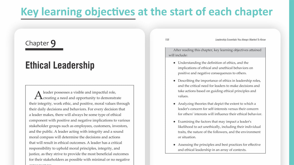 An exceptional work on the foundation and practice of leadership within today's society. The author does a wonderful job in moving skillfully from the overall purpose of leadership, to the attributes & behaviors of those who are effective at it, onto the various situations that can arise within this area of management, with emphasis on the attributes needed to successfully handle them. What's most impressive to me is that all of this is covered in a concise, readable 200-page format, making it a 'go-to' resource for any college professor teaching a course on this subject. I highly recommend this dynamic, user-friendly text and plan on using it myself in the future.