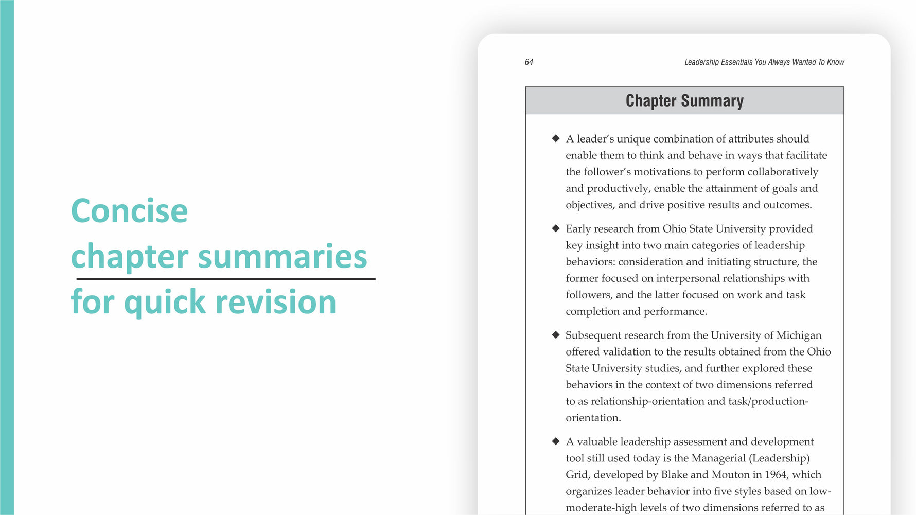 As the title suggests, this is an overview of leadership, including its aspects and variants. This is well written, concise, and includes quizzes and references so students and teachers can dig further.