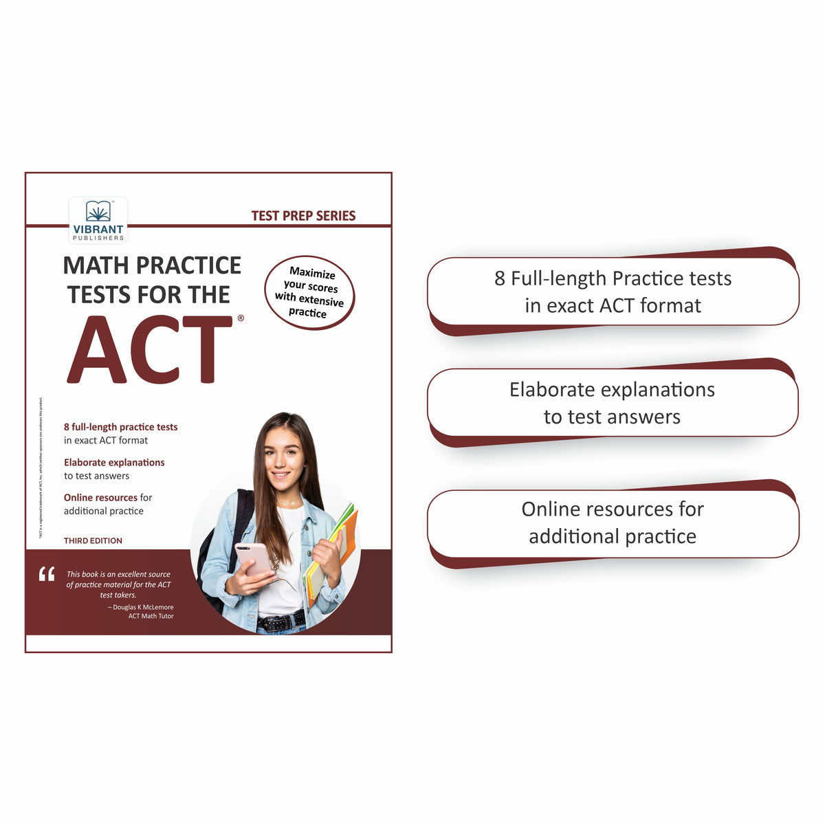 Virbrant Publishers has created 8 ACT math tests that accurately mimic the content found on real ACT tests. They even some problems that are harder than normal ACT math problems that will challenge the student. These tests provide excellent practice for the test taker. Each question answer is explained and even the wrong answers are explained why they are wrong. I believe this book will help students succeed on the ACT math section.