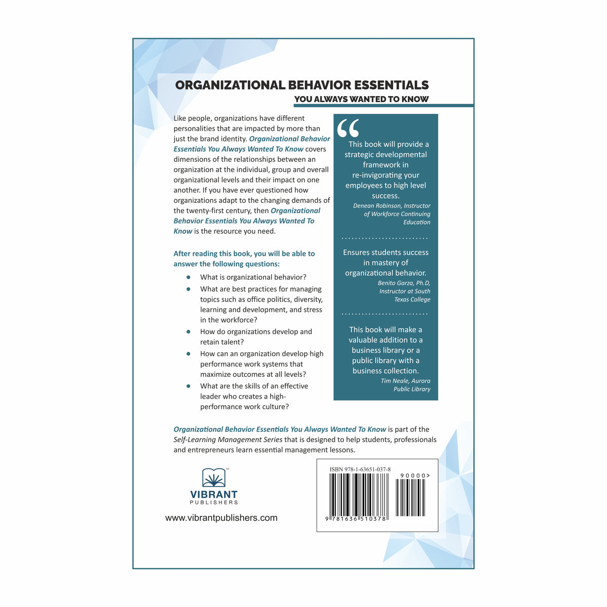 This book will be an industry standard on how you provide a blueprint in creating a more sustainable and equitable work environment. Organizational Behavior Essentials You Always Wanted to Know will provide a strategic developmental framework in re-invigorating your employees to high level success.