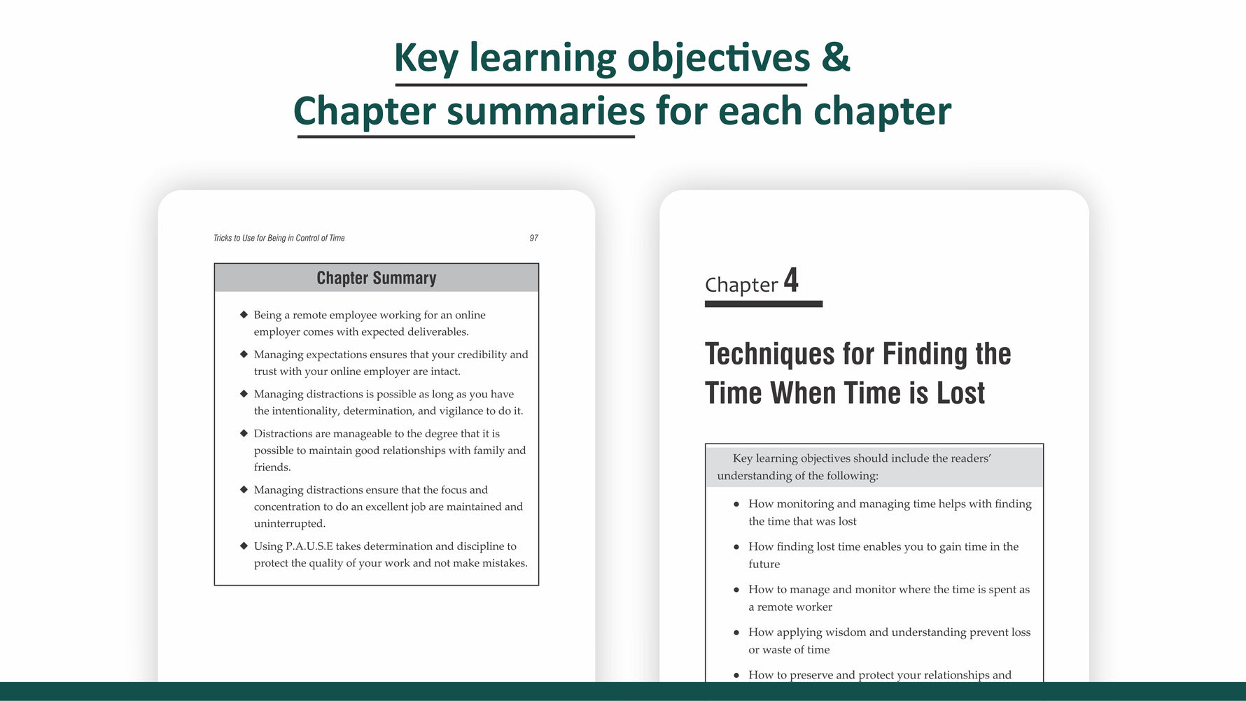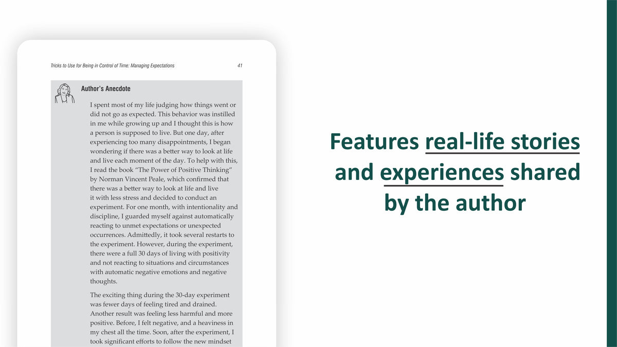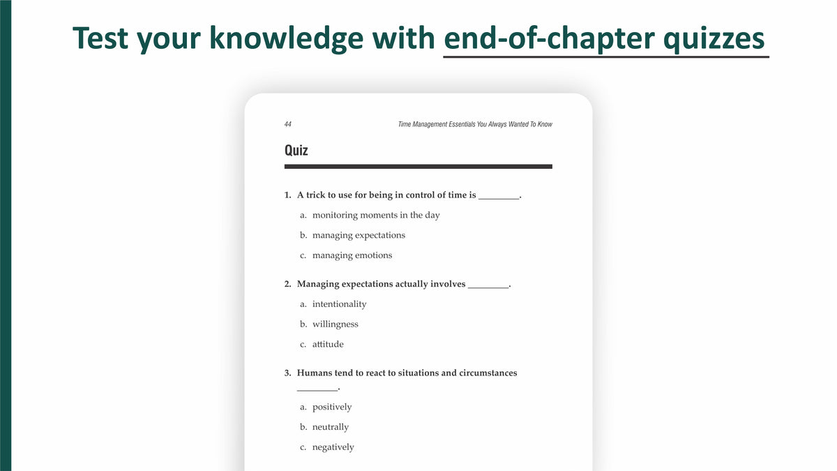 Working Backwards and Time-Blocking charts are useful tips given by the author. The quizzes at the end of every chapter are a nice way to recall the chapter.