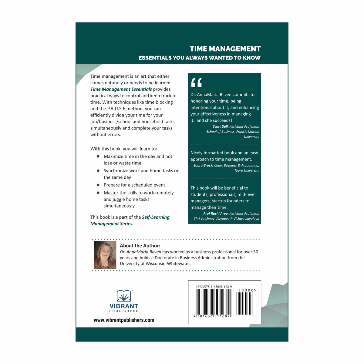 Dr. AnnaMaria Bliven commits to honoring your time, being intentional about it, and enhancing your effectiveness in managing it…and she succeeds! She highlights insights from a variety of sources and expands on her own insightful ideas to effectively manage this invaluable resource. As a consummate educator, she includes tools and resources that will add to your successful integration of her ideas into your busy lives. Additional resources, effective in reinforcing the concepts and ideas while helping you to act include learning objectives, templates, charts, and suggested printouts to post/use, along with learning objectives, chapter summaries, concrete examples, author’s anecdotes, acronyms, and quizzes. These resources will help you to best understand and implement her ideas and integrate them into your time management practices. And you do want to implement them. As an accomplished academic, her references and citations give you additional access to other appropriate sources as well. Though many of her insights might be considered common sense, especially after you read them, you end up realizing that they are not so common. Whether you are an employee, student, parent, or manager wishing you had more time, your dreams can come true. Take control of your time and make up for the lost time. It’s time to not only read this book but take action to enhance your path to success by applying these ideas and insights today! Read and implement ideas found in this practical guide. Wishing you intentionality and positivity, as encouraged in this book. Thank you, Dr. Bliven for sharing and inspiring!